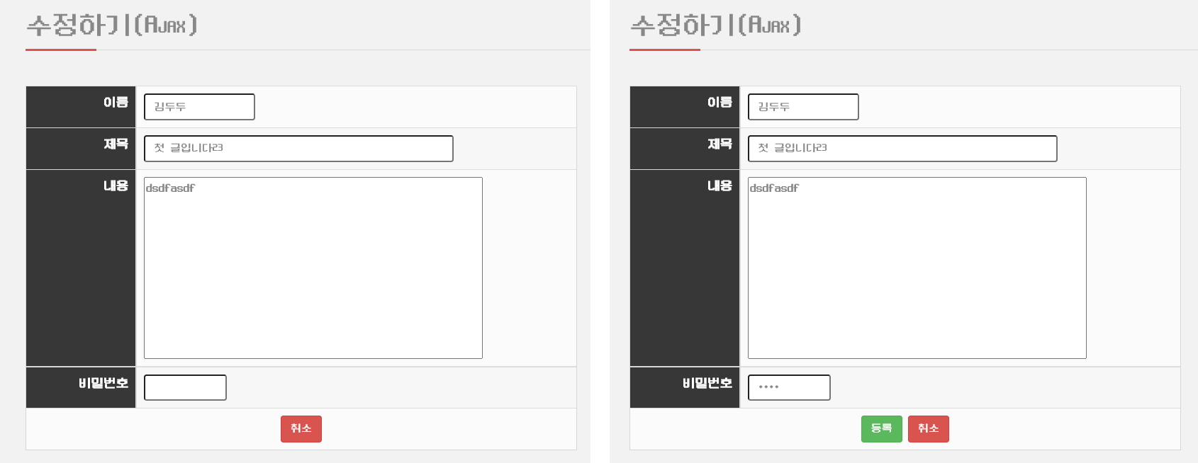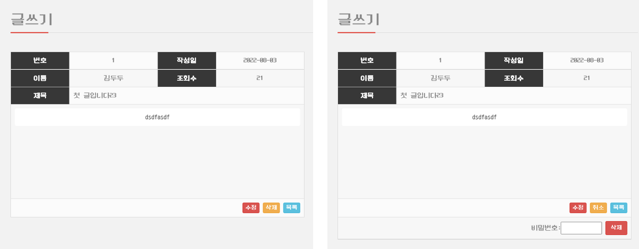 (1) detail.jsp에서 "삭제"버튼을 클릭하면 나타나는 입력칸에 비밀번호를 입력하고 버튼을 클릭하면!