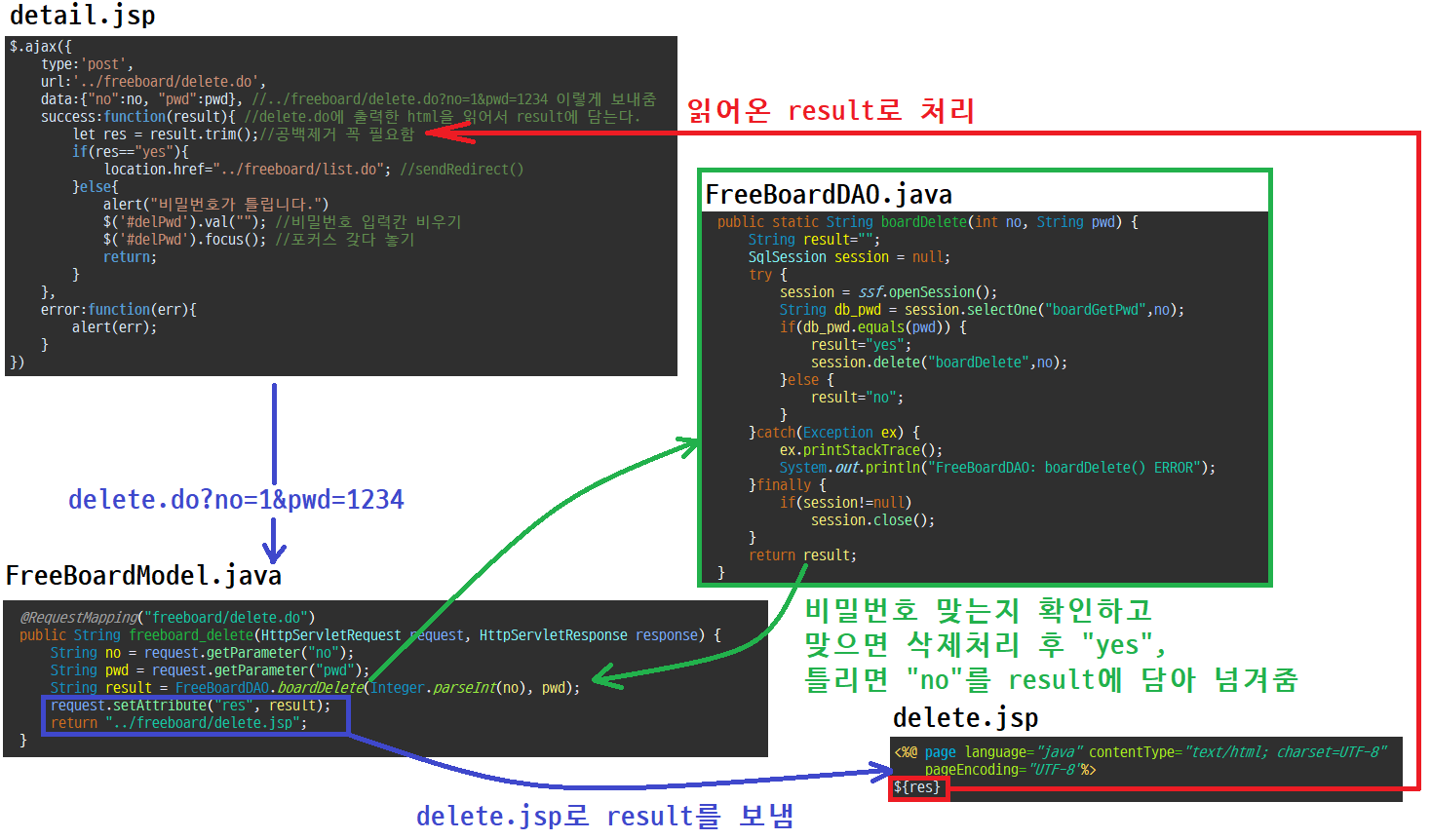 → detail.jsp의 ajax 코드에 의해 "../freeboard/delete.do?no=1&pwd=1234"와 같은 요청을 전송한다.