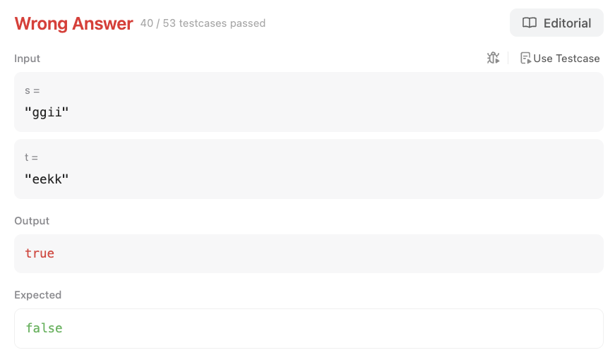 I thought that if the sum of the converted values matched, the strings might contain the same characters!