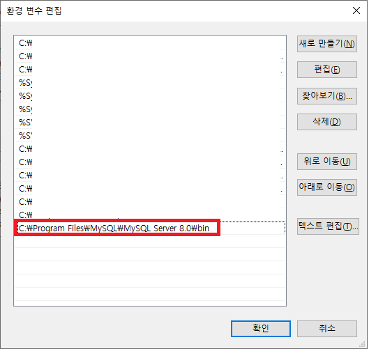 설치후 MySQL bin 폴더의 경로를 환경변수에 추가
