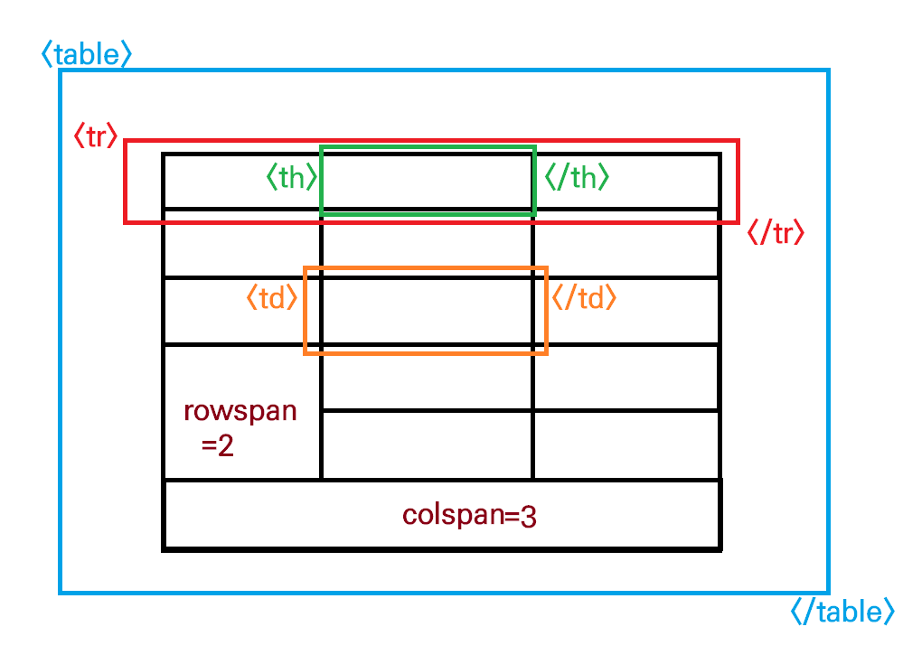 <tr> table row , <th> table header, <td> table data