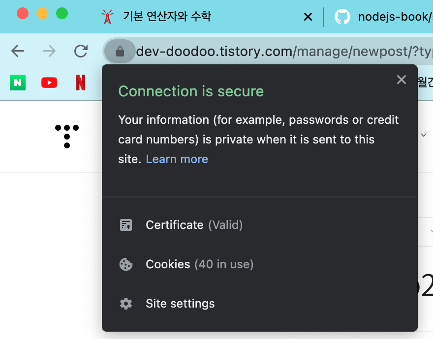 https가 적용되면 구글 크롬을 기준으로, 아래 이미지처럼 주소창 옆에 자물쇠 아이콘이 뜬다.