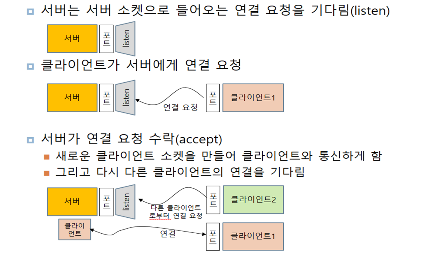 개통이 끝났다면 전화가 잘 오는지 한 번 들어봐야 한다. = listen() 메서드
