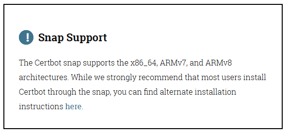 그리고 Certbot snap은 x86_64, ARMv7, ARMv8 과 같은 아키텍처를 지원한다.