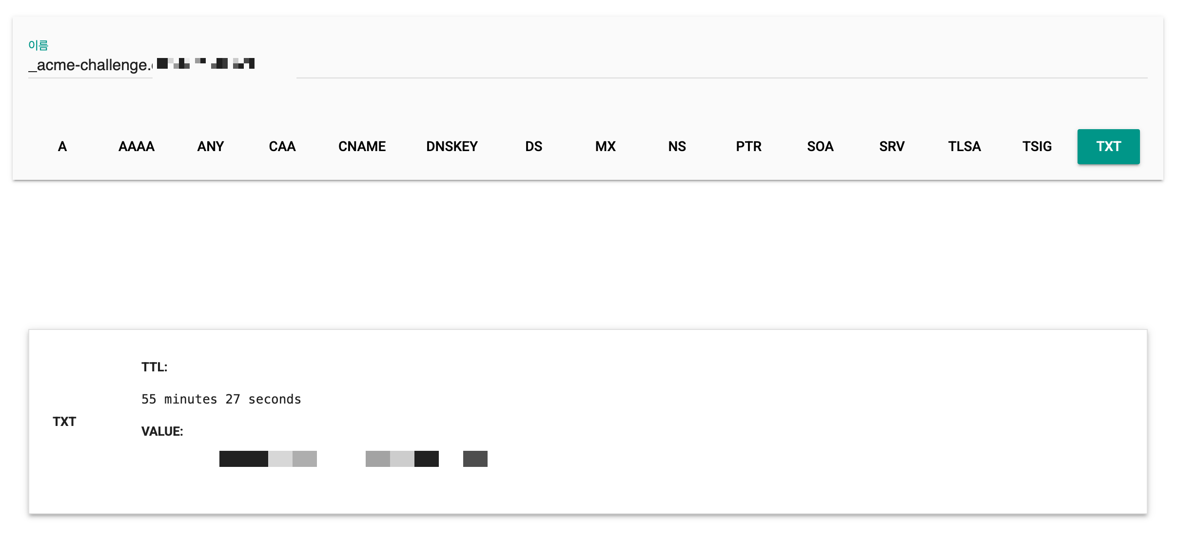 Let's encrypt가 제공한 토큰을 _acme-challenge.<YOUR_DOMAIN> 의 TXT 레코드에 저장하면,
